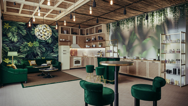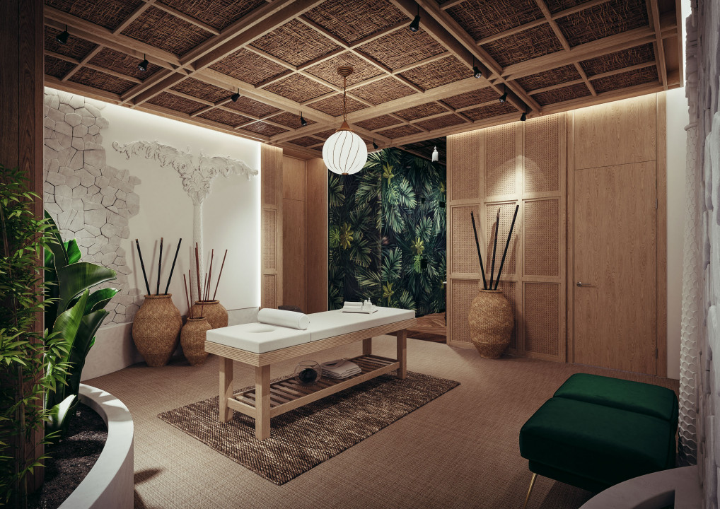 CGI excels where physical sampling fails, allowing studios to demonstrate material rigor and architectural atmosphere simultaneously. In wellness and F&B design, materiality is paramount. Photorealistic CGI accurately simulates how complex textures—like varied wood grains, rattan weaves, and custom stone patterns—absorb and reflect light.