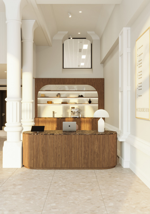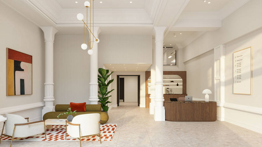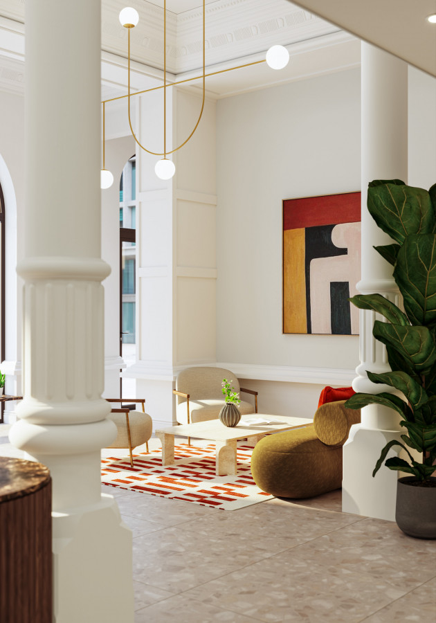 On the ground floor, golden-hour lighting opens the space gently, allowing columns, mouldings, and heritage details to read with clarity while remaining understated. Against this backdrop, richer tonal accents and contemporary furniture pieces establish a balance between past and present—an atmosphere shaped for both hospitality and reception.