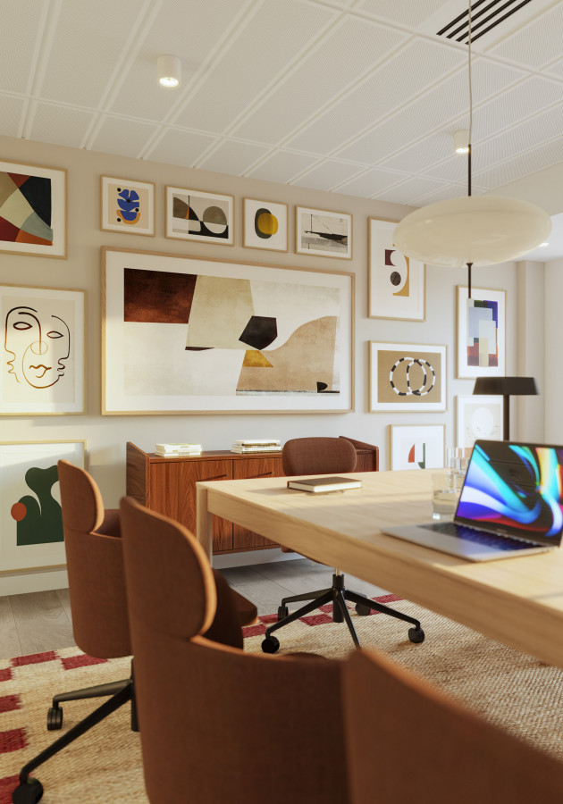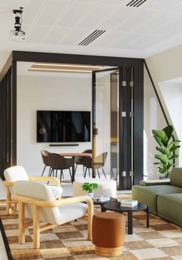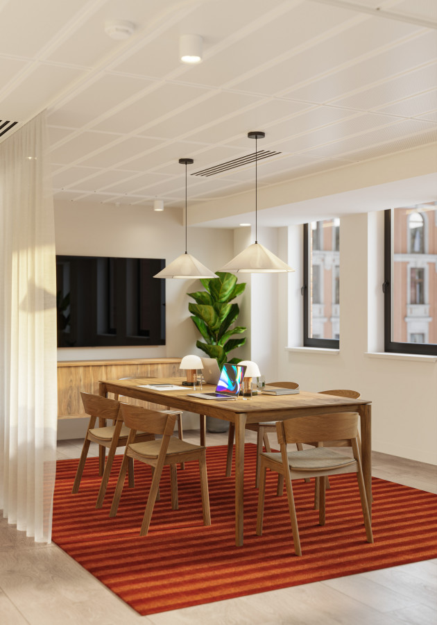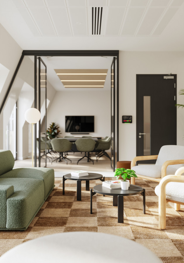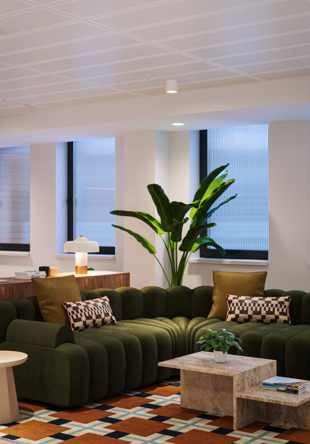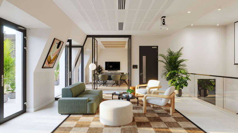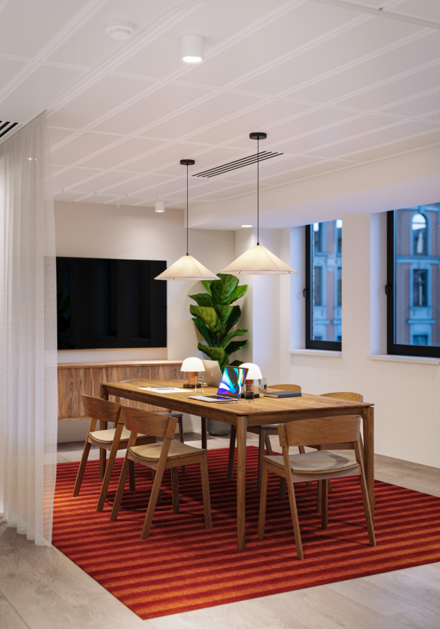 On the upper levels, the visual language becomes more residential in tone. Soft mid-century influences, layered textures, and carefully scaled breakout areas bring a sense of calm to the workday. In evening scenarios, the mood shifts again: warm pools of local light deepen the colour palette, giving the space a quieter, more intimate character without losing its functional intent.