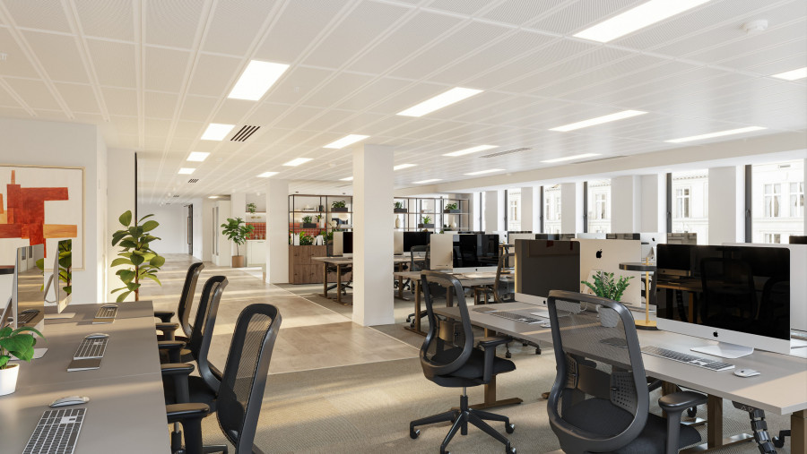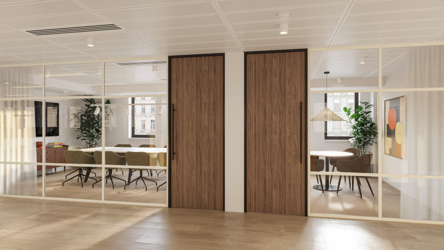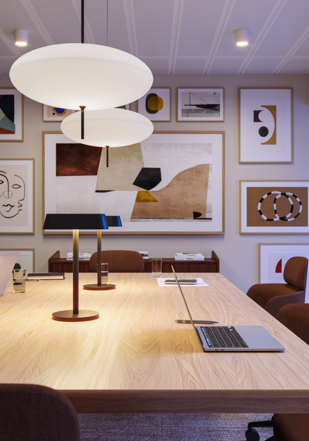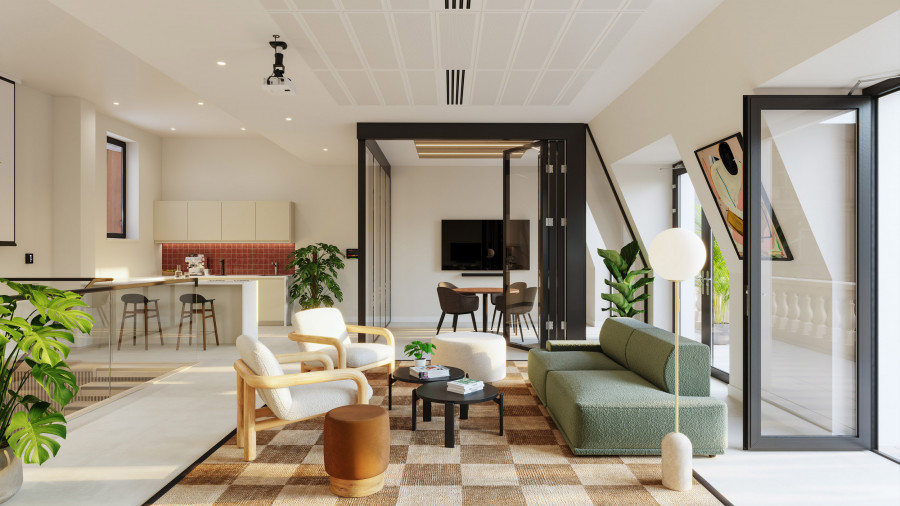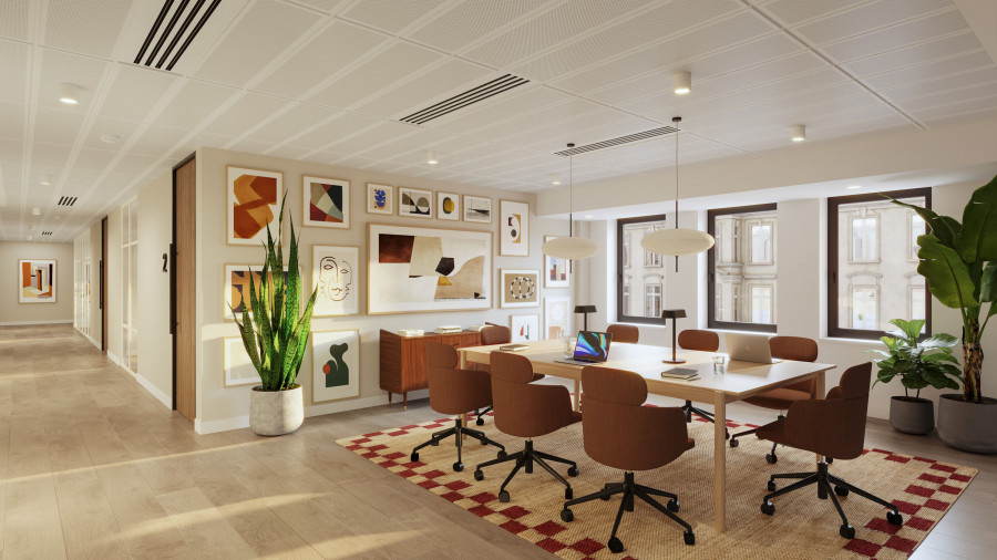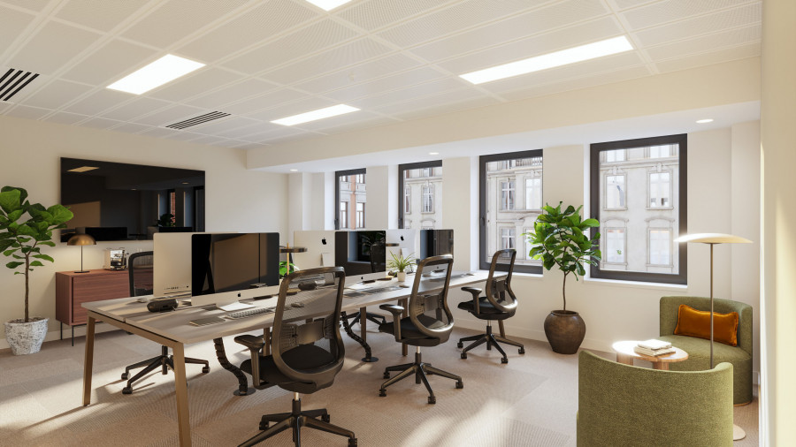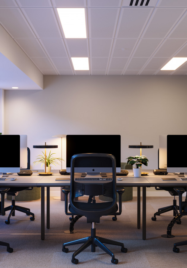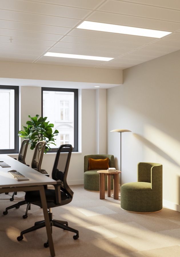 On the upper levels, the visual language becomes more residential in tone. Soft mid-century influences, layered textures, and carefully scaled breakout areas bring a sense of calm to the workday. In evening scenarios, the mood shifts again: warm pools of local light deepen the colour palette, giving the space a quieter, more intimate character without losing its functional intent.