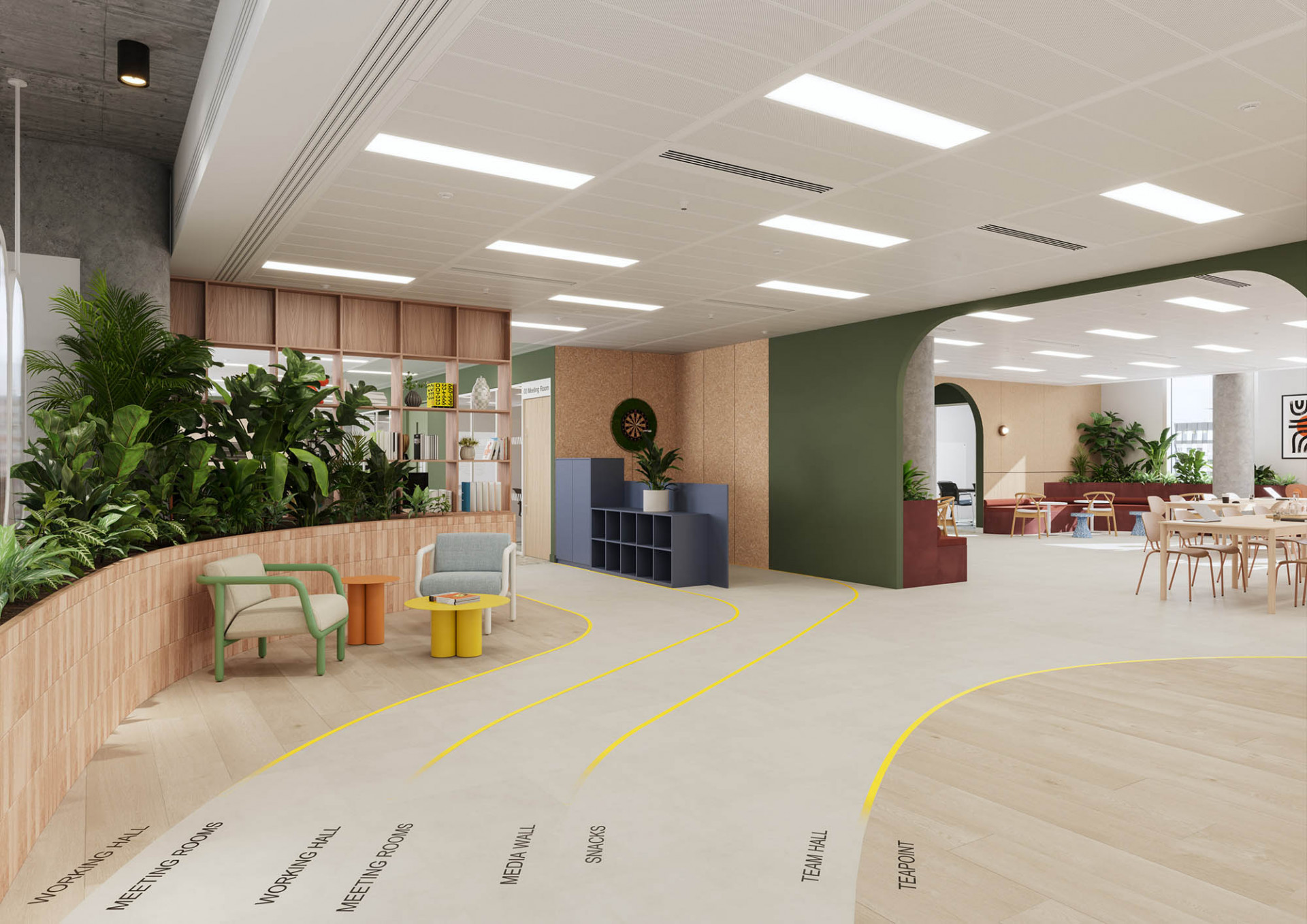This workplace is structured around a shared social and breakout zone that acts as the centre of the floorplate. From this core, workstations, meeting spaces, and quieter areas extend outward, allowing the office to remain open while clearly organised by function.