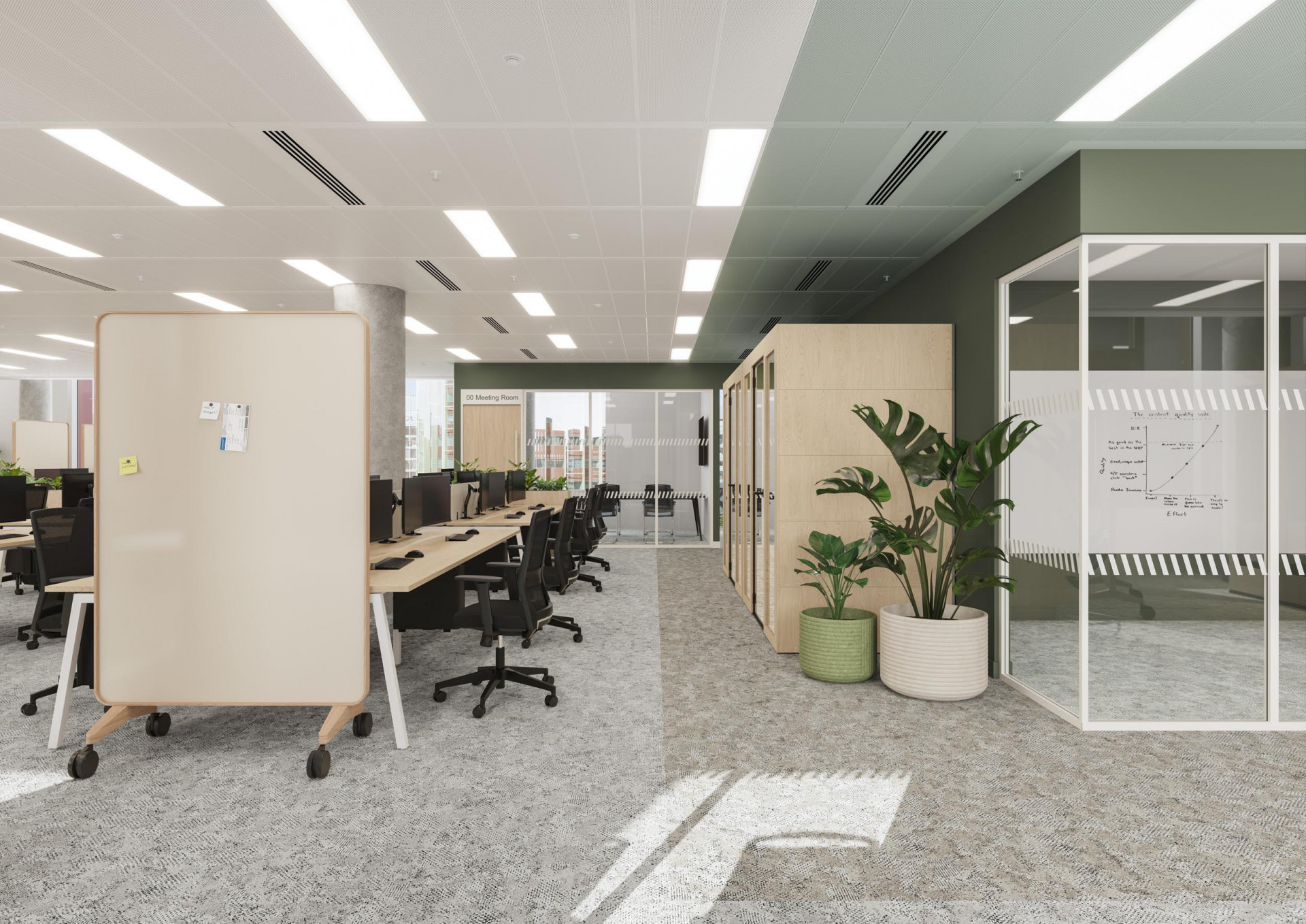 The CAT B fit-out introduces a consistent material language across the space, using warm finishes and soft architectural elements to define zones without enclosing them. Circulation routes are kept clear and direct, supporting easy movement between collaborative and focused areas throughout the working day.